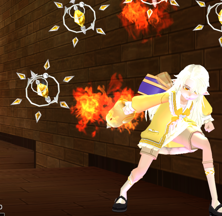 엘나 스킬 중 파이어 리프 어택을 쓰면 캐릭터가 공중에 날아 올라 찍는 모션을 하며 스킬이 사용된다.