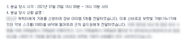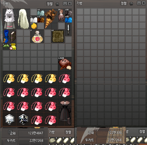 저는 정식 업데이트 점검 이후 가방 순서를 모두 바꾸었고, 가방에 악보 스크롤(1000)이 있었으며, 이 스크롤을 17시 30분 점검 이후 바닥에 떨어트려 다른 유저에게 주었습니다.