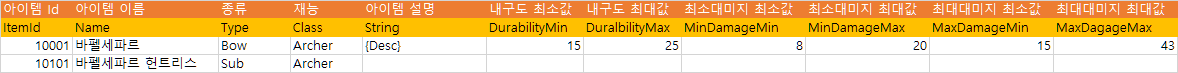 아이템을 구분하기 위한 고유의 Id가 있겠죠. 그럼 Item.xls이라는 데이터 테이블은 이렇게 구성됩니다.